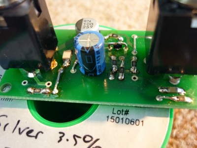 Below are photos of my prototype BMG booster including pics of repairs that I did recently to a surface mount 47uf cap which had broken off the board. I replaced it with a standard size 47uf capacitor, the blue one you can see in one of the pics.