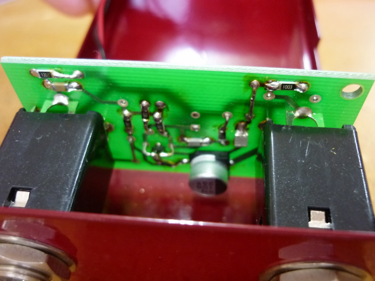 This prototype for the Brian May/BMG Treble Booster was based around my Treble Booster Touring design but was planned to have surface mount components which hopefully would reduce manufacturing cost.