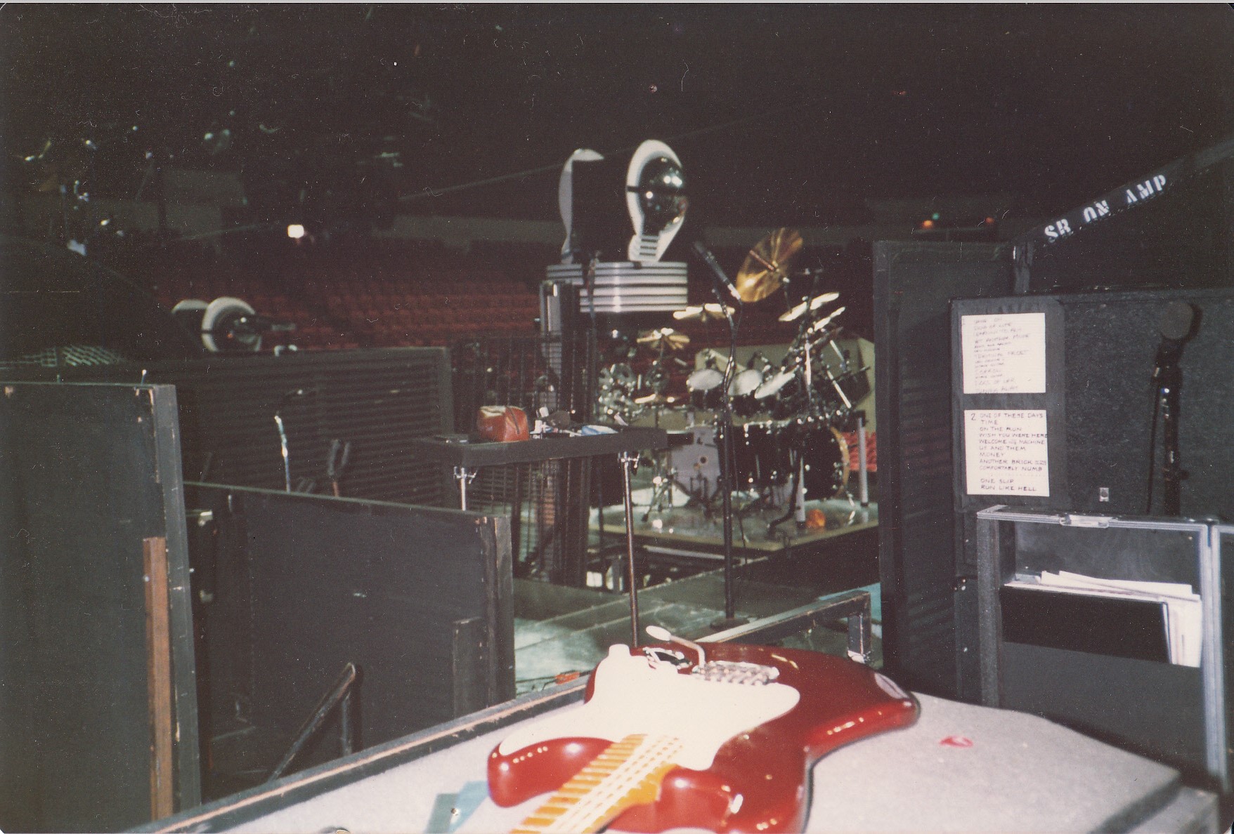 2nd guitarist’s guitar rack. One of David’s maple neck Strats lying flat on top of the roadcase at far right. Phil showed me both of David’s main stage Strats; the candy apple red one which was the preferred stage Strat at the time and also the white maple neck Strat. Both were from the Fender reissue 1982-3 series with Alder bodies and maple necks. Not period correct reissues of course but very nice guitars nevertheless.