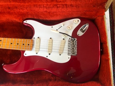 Photos below are of David Gilmour’s 1984 vintage ’57 re-issue Candy Apple Red Stratocaster after it was purchased at auction.