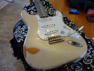 The white guitar’s fingerboard was made almost 1/16″ wider than the black guitar’s original 1960 neck – all the way down from the nut to the 21st fret. Ian has told me several times over the years that the extra width of the neck has worked out very well.