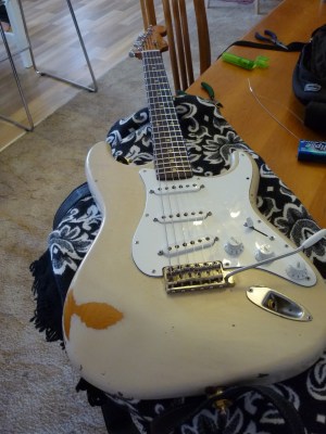 Fingerboard radius was kept to the same as on Ian’s Black Strat old neck – its fingerboard curve had been modified and flattened in the early 1980s by Rick Harper at Rock Repairs to be almost identical (around 11″ radius) to the favorite fingerboard radius curve that I have used on many of my custom made guitars since the early 1980s. Fingerboard dot mix was my old favorite – an epoxy resin filler which came from my experience with sailing boats. White Epiglass Epoxy Resin Filler was mixed with a slight caramel colouring to approximate the look of the wonderful ‘clay’ dots of the Pre-L and L series Fenders of the early 1960s.