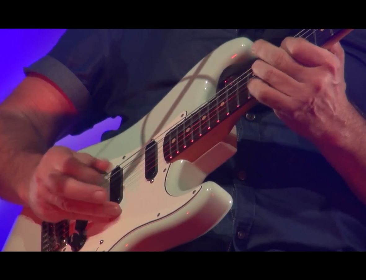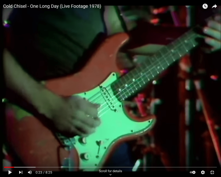 The screenshot below taken from the 27 August 1978 ABC video of Ian playing and singing ‘One Long Day’ live with Cold Chisel shows the guitar with its original pink/red Fender® Stratocaster® body, pickups and scratchplate. The peeling paint near the right forearm area of the body is evident, as is the cracked scratchplate at the neck pickup bottom E screw hole area. Cracking is a very common problem with the old 1960s Fender® celluloid scratchplates which shrink with age.