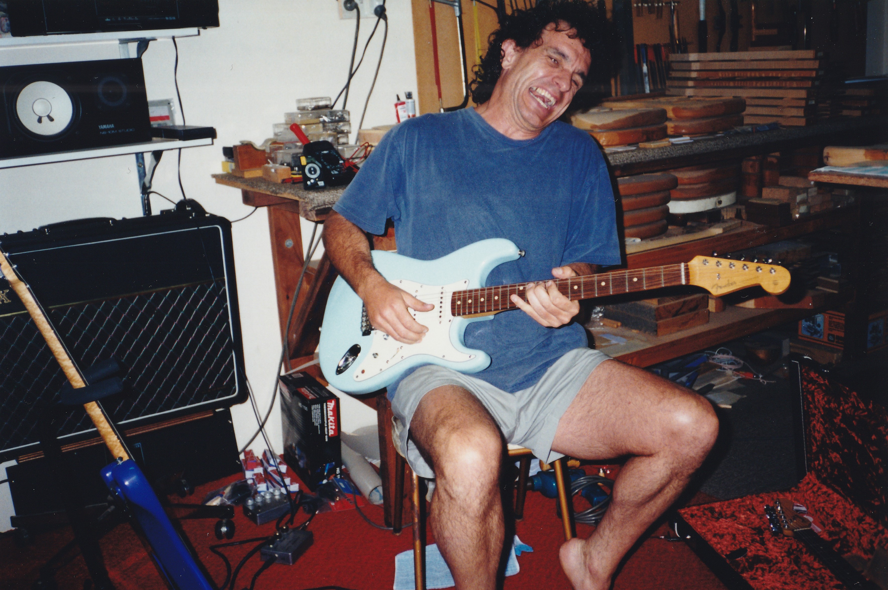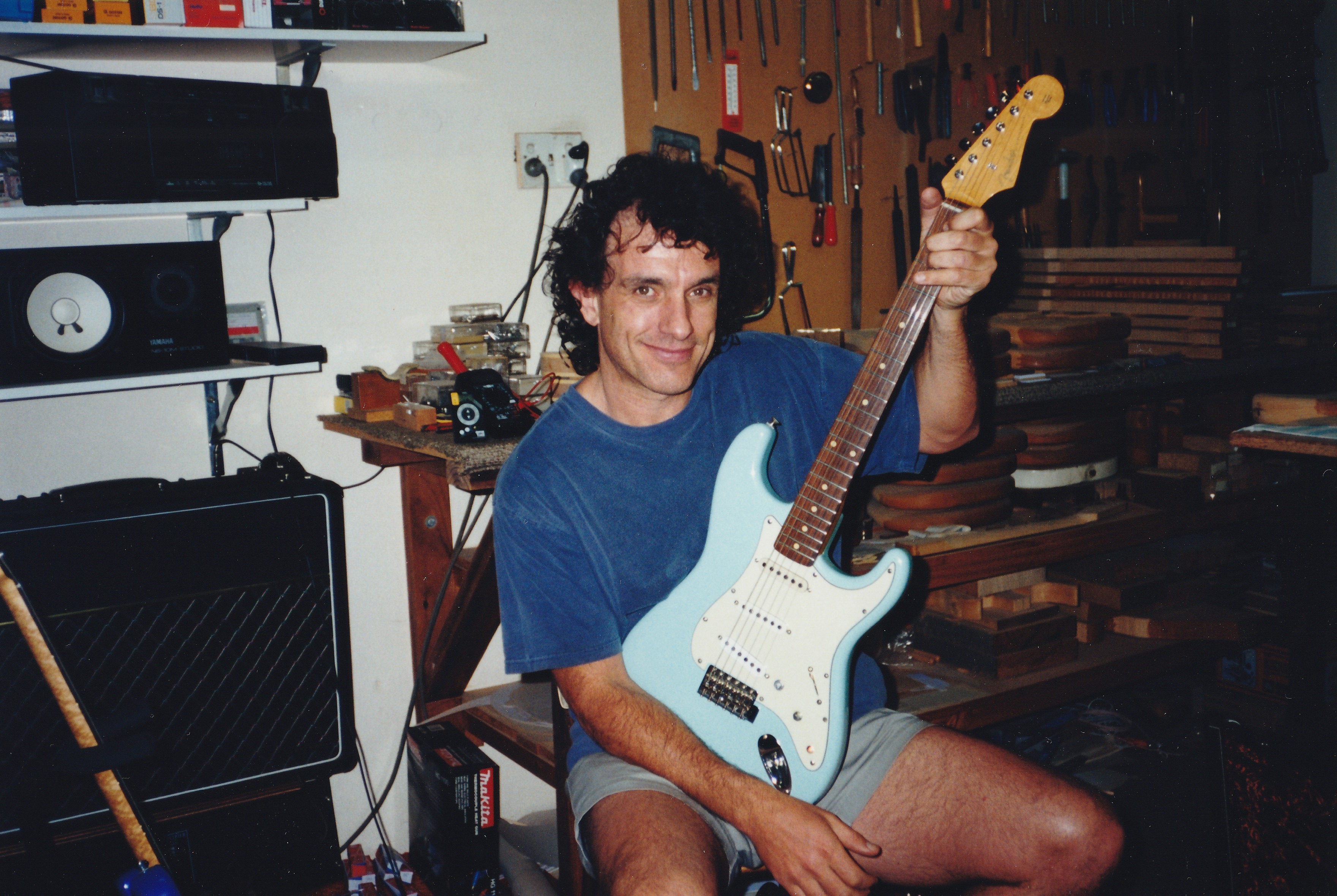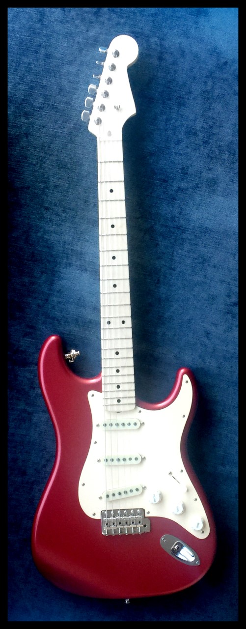 In mid 2019 Ian discussed the idea of having a maple neck version of my 1989 white guitar made. I had not made any guitars since 1997 and suggested that we consider the USA company Musikraft who are licenced by Fender USA and make good quality guitar necks and bodies to custom requirements. In late 2019 the neck and body were made by Musikraft and were shipped to Australia, whereapon they were given final touches, and were painted and assembled by Sydney luthier Frank Grubisa. The completed guitar was nicknamed ‘Ruby’ after its colour. Details and photos are below underneath in the Black Guitar section.