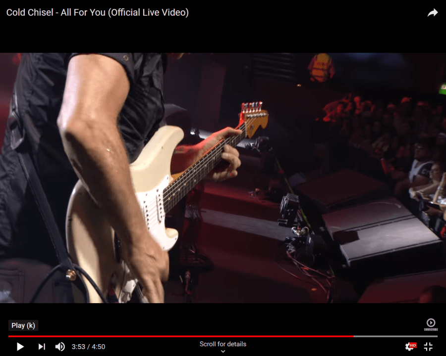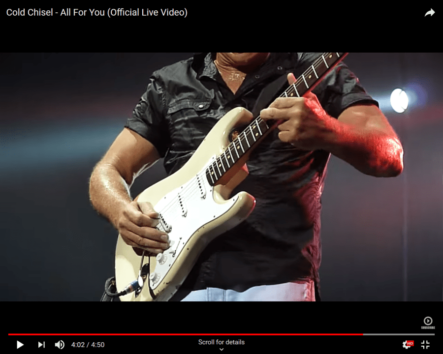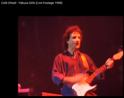 Ian and the black guitar also feature in Cold Chisel’s official video for ‘Bow River’ (below) although the footage cuts at times to Ian using a white guitar.
