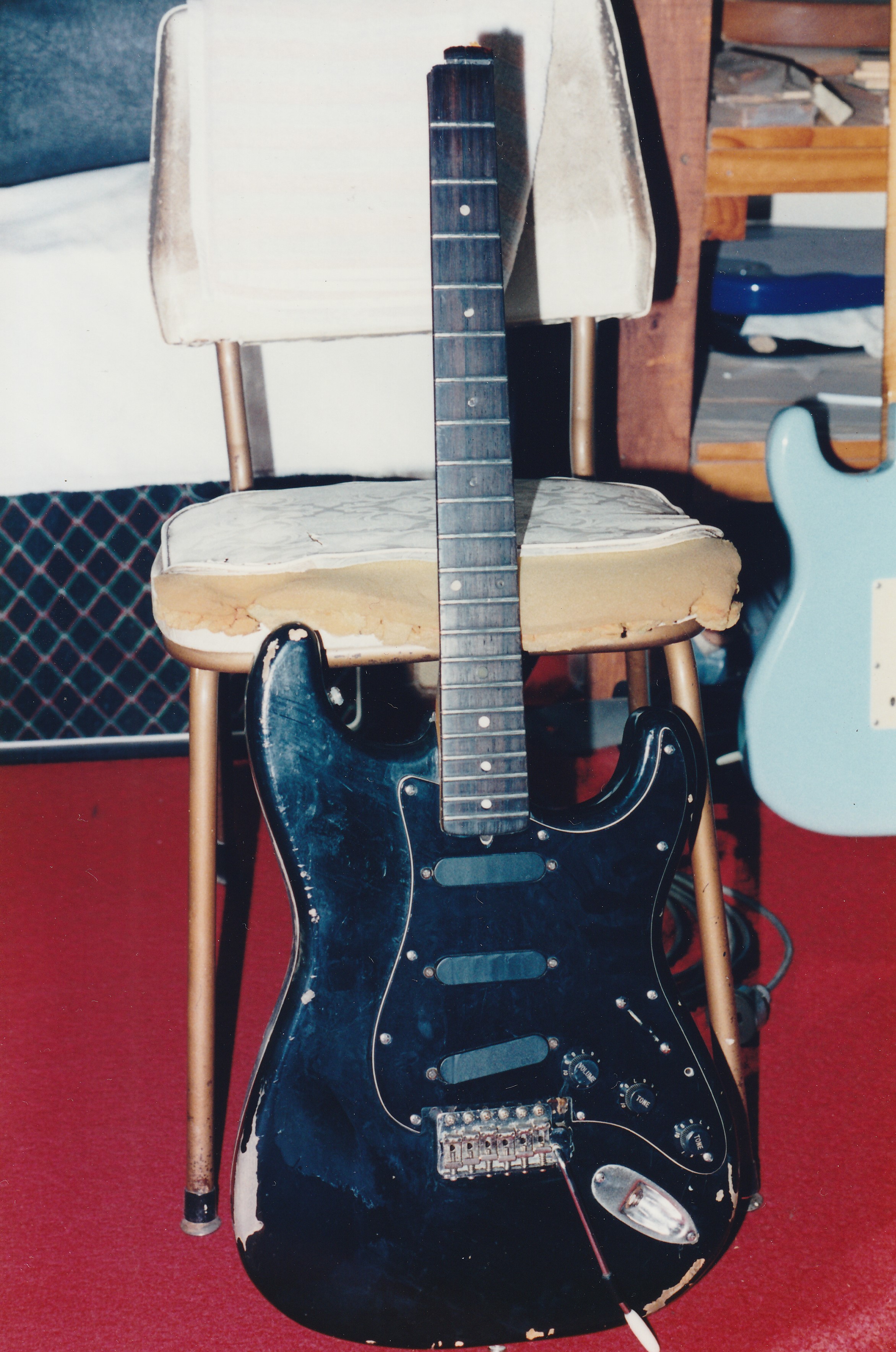 In the early 1980s the original 1960 neck was fitted to an early 1970s Fender® alder Stratocaster® body which was painted black. The black Fender® body was modified by Rick Harper at Sydney’s ‘Rock Repairs’ who did all of Ian’s guitar work at the time. The early 70s body was made for the Fender® ‘micro-tilt’ 3 screw neck attachment plate, and was then modified by Rick to suit the earlier (and more stable) 4 screw neck plate which the neck was drilled for.