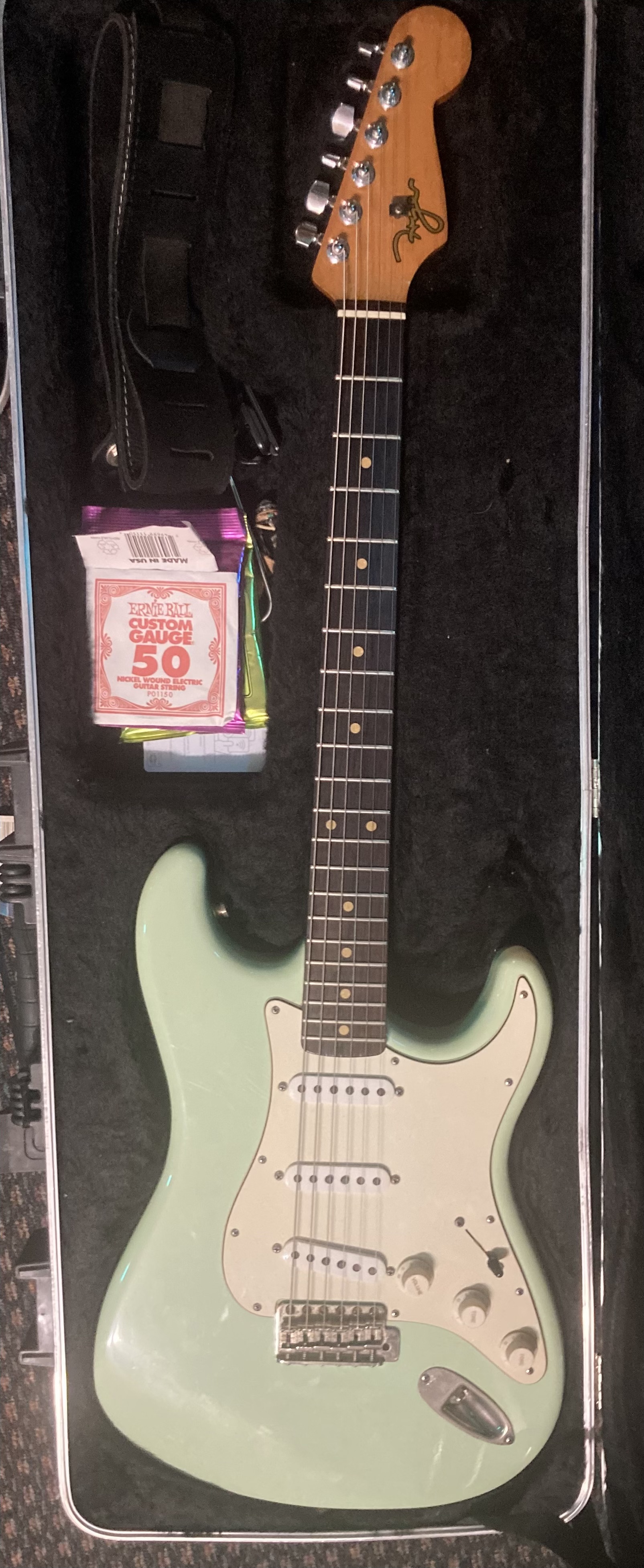b) Spearmint Green ‘Minty’ which originated from Ian’s ‘Black Strat®’. This guitar’s history is detailed further below. It has the neck that I handmade in late 1996 as a replacement for Ian’s original 1960 Strat® neck from the black guitar which was unfortunately broken on stage at Shellharbour Workers club.