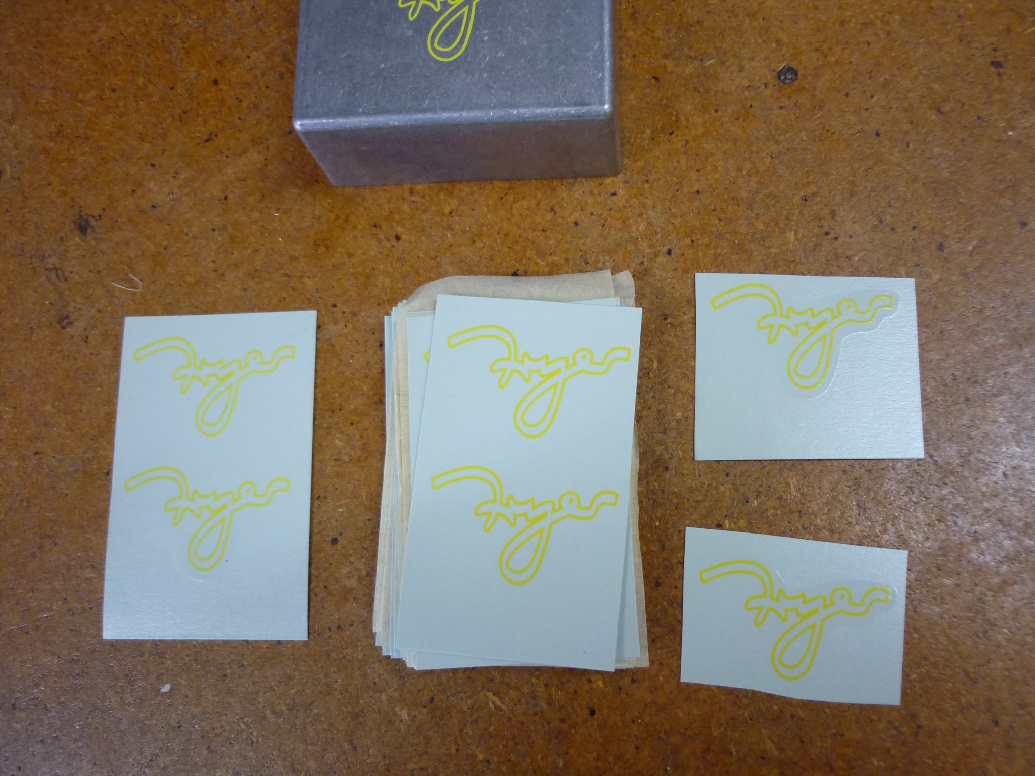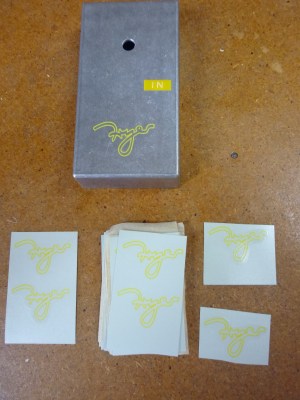 On the JAN97 25th Anniversary re-issue treble boosters I am using the same vintage Dymo yellow embossing tape as on the originals, and the same 1997 batch ‘Fryer’ yellow logo waterslide decals that I used on the original JAN97 pedals and on the headstocks of my 3 Red Special replica guitars John, Paul and George Burns (pic below).