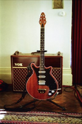 January 1998: Fryer Red Special ‘Paul’ still on the stand and lead plugged in having been used by Brian May to record with the previous night. Guitar is in main large room and in front of mahogany Rose-Morris AC30 circa 1990 only there for its decorative function and not used for recording.