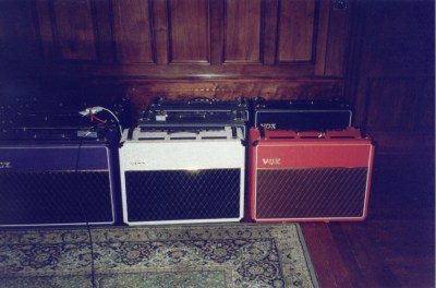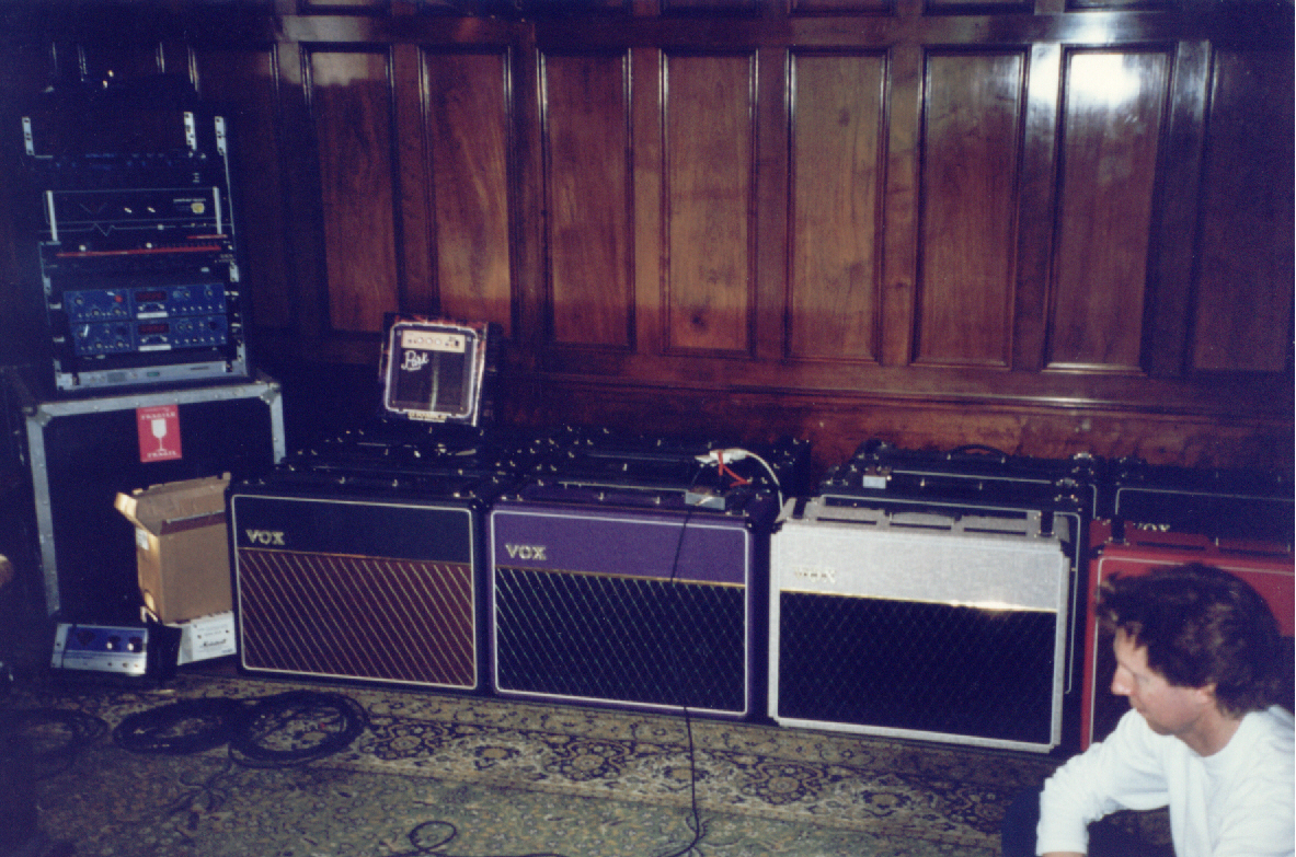 Allerton Hill guitar room July 1998, Greg Fryer at right, JAN97 booster sitting on top of purple AC30 in centre of photo. Photo courtesy of Mark Reynolds