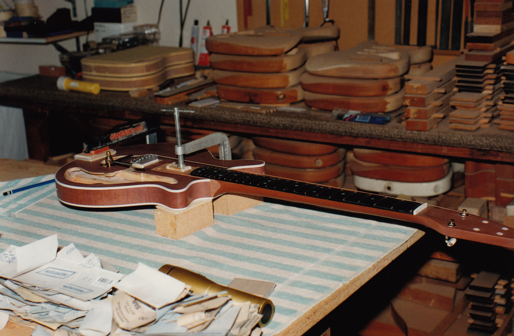 John neck and body glueing with West System epoxy resin; body and neck are masked up to avoid epoxy spillage/fingerprints etc on paintwork only 3mm approx around the glue joint is exposed area