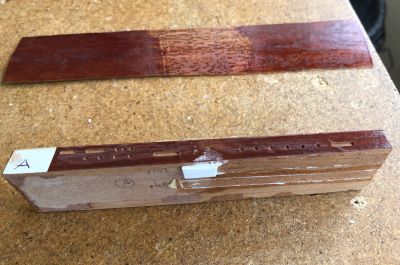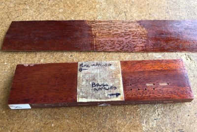 First I did a test run on a piece of mahogany which Martin James (from Foxell and James the paint suppliers) and I had prepared with stains to attempt to replicate the Red Special’s red Furniglass stain overcoated with Rustins Plastic Coating. I also used this test piece to assess different combinations of glues for the re-glueing of the white binding on the Red Special’s body.