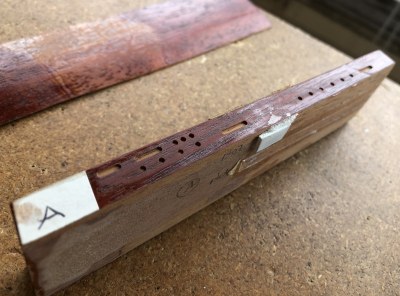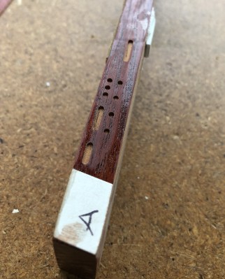 Neck: mahogany dowels made for glueing into various screw holes in headstock, these screw holes were from the first set of tuning heads which Brian fitted when the guitar was made, and also from the Gotoh locking heads which were fitted sometime in the 1980s.