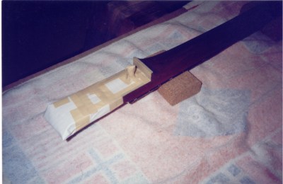 Thanks to Mark Reynolds for the next series of photos taken on Monday 4th May 1998 at Leicester at his step father’s spray painting booth. Photos show preparation before spray painting the neck and body, with everything masked up and degreased several times to remove oil, wax and silicone contaminants from the surface to be painted.