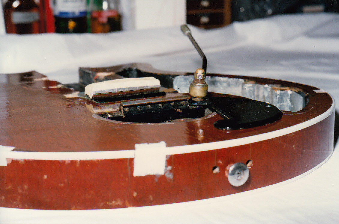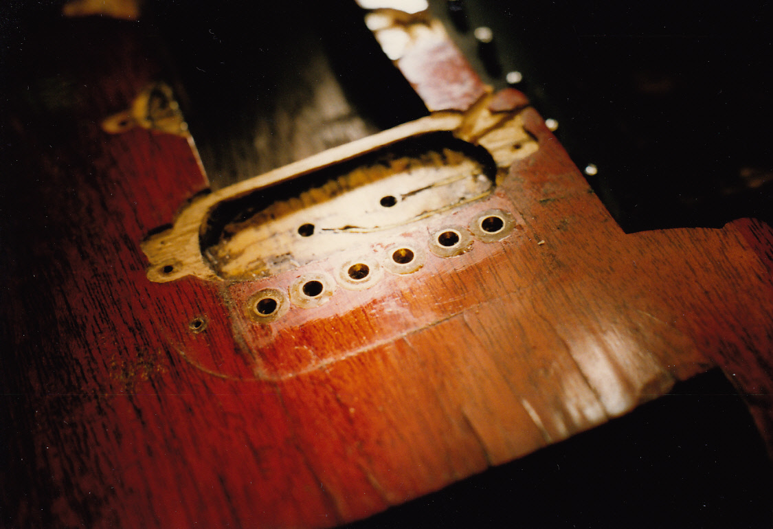 Bridge mounting brass inserts and original bridge pickup cavity. The black piece which usually fills up where the deeper original bridge pickup sat is made Brian told me from a piece of rubber sole from a shoe. This gave us a source of pun-laden Beatles ‘Rubber Soul’ jokes!