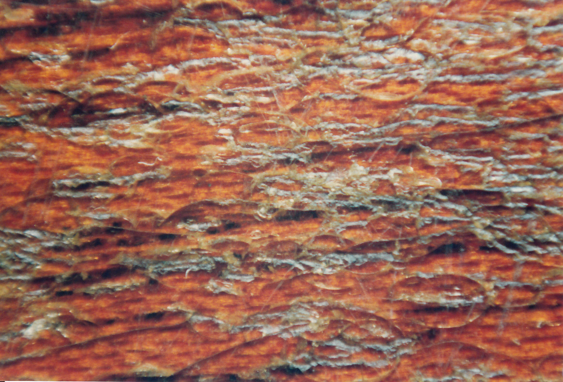 Close up #2 of damage from 30 years of playing, undoubtedly the sixpence is the main offender here causing the fracturing and gouging