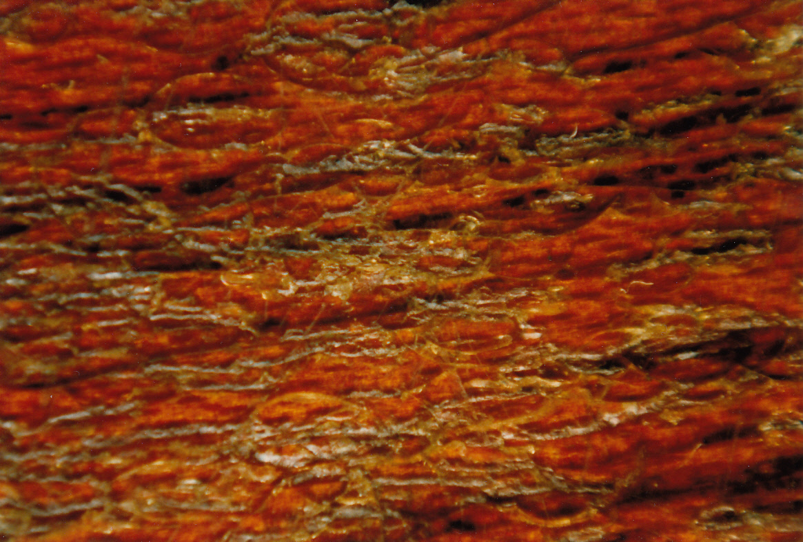 Red Special body Rustins experiments with overcoating. Brian and I decided to brush Rustins Plastic Floor Coating onto a couple of relatively inconspicuous areas to see how the lacquer under would look and if there was going to be any adverse reaction. We first degreased thoroughly and prepared the surface with several abrasives including mainly the excellent 3M multi-flex abrasive pads supplied by my friend Alan Bottle from 3M Sydney. These pads allowed us to sand better into the difficult surface ‘crevices’ so that the fresh Rustins would have good adhesion to the worn fractured surfaces. Soon after however, Martin James from ‘Foxell and James’ in London told Brian and I about the original style Rustins Plastic Coating. Other paint stores had told us this didn’t exist and the Rustins Plastic Floor Coating was the only product now available, but Martin having had decades of experience in the paint trade knew his subject well and sourced us the original Rustins Plastic Coating which apparently didn’t have the melamines and other additives which made the ‘floor coating’ product more flexible but less see through. The two closeup photos above are of the area that we painted near the binding