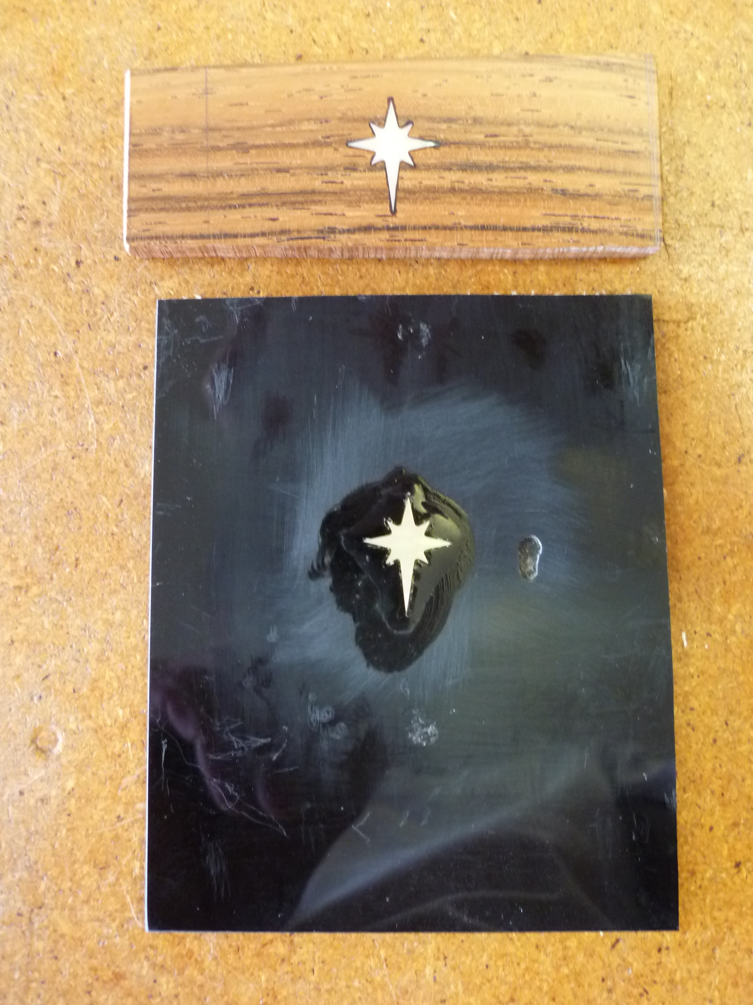 Practice pieces for inlaying the mother of pearl Maystar shape into: above Brazilian Rosewood practice run of several for George Burns’ gold pearl star; and below a piece of black perspex/acrylic being one of several practice runs for the inlaying of the white pearl star into the Red Special’s scratchplate. This shows a glue that I decided not to use because of the whitish voids which happened especially around the points of the star. Again it was one of Alan Bottle’s 3M glues which was used for the glueing of Brian’s scratchplate star