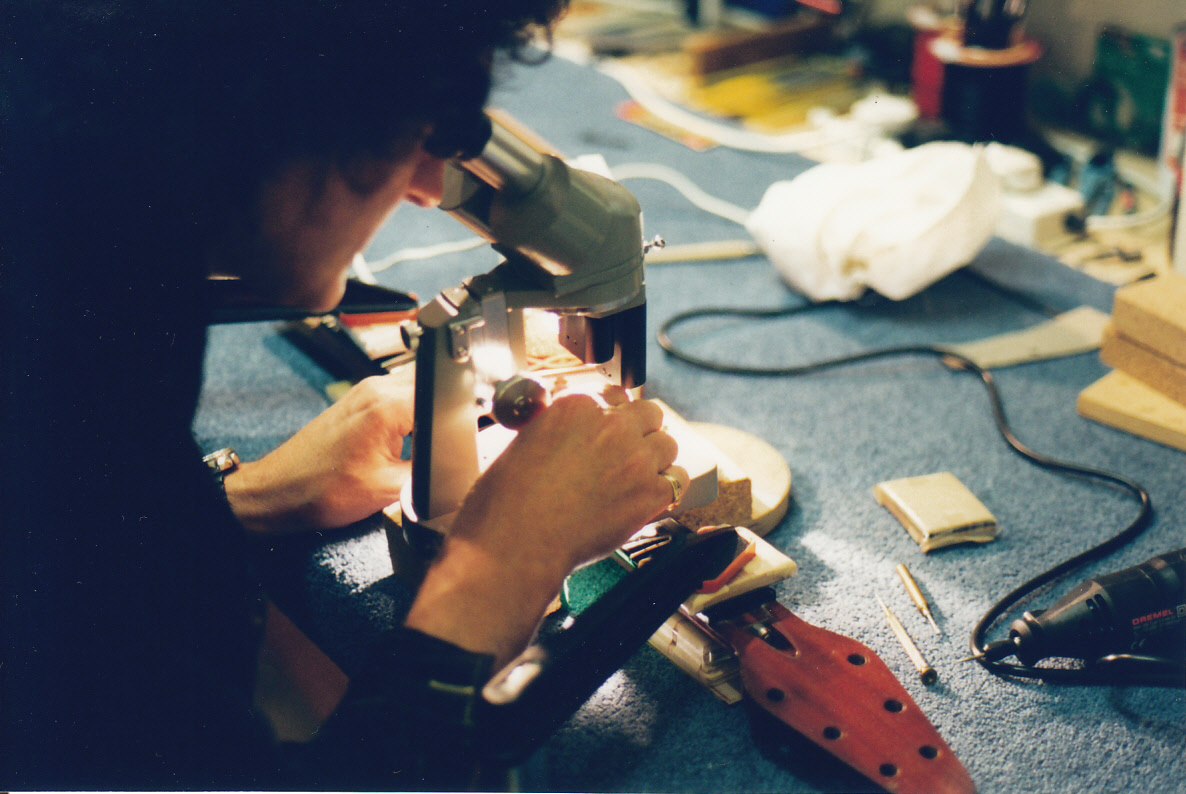 March 1998: Brian examines under a microscope the Red Special’s 5th fret dot marker hole after the temporary red wooden dot was removed. The fingerboard area surrounding the dot marker hole had worn greatly over the years and this posed a difficult repair dilemma