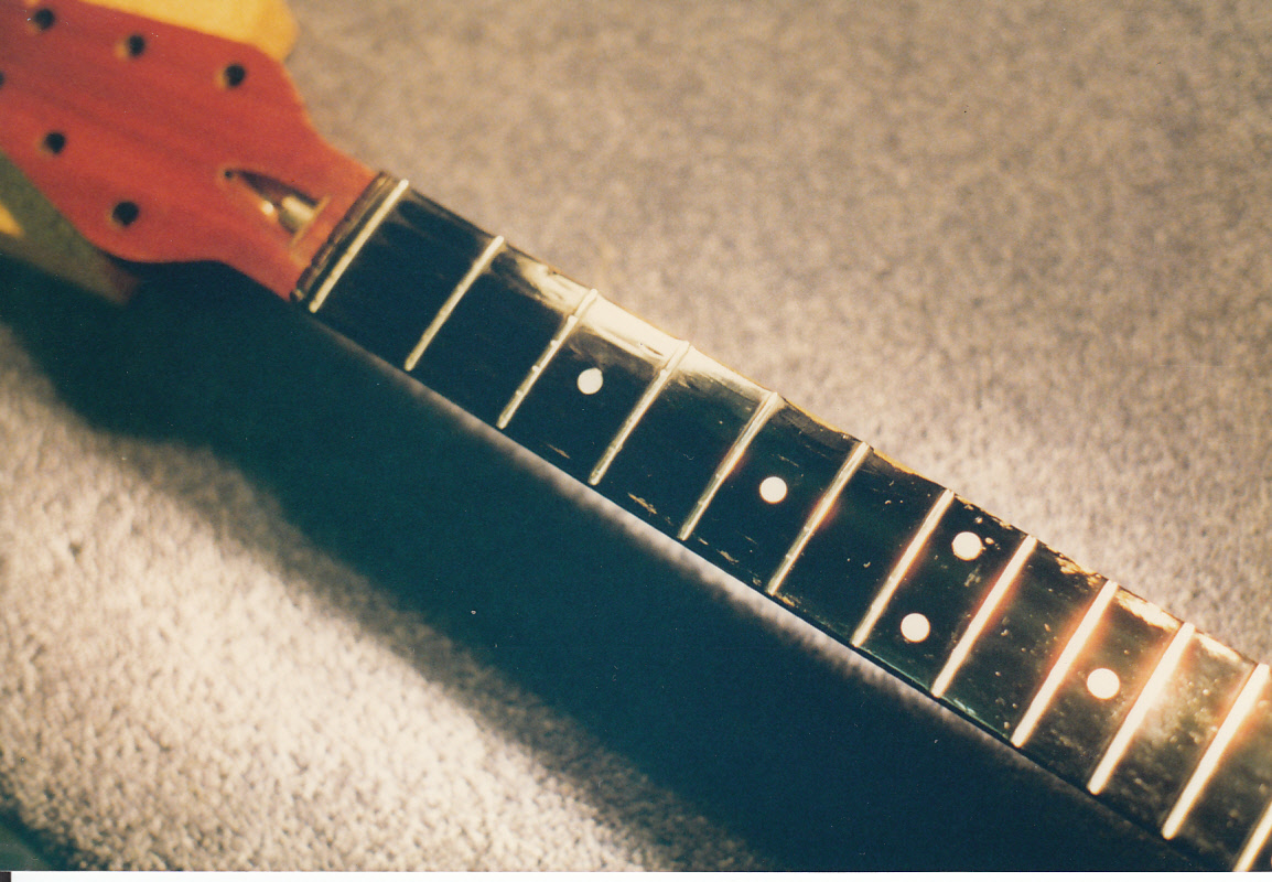 Red Special fingerboard after dot and black epoxy resin mix were filed and sanded level with the fingerboard surface