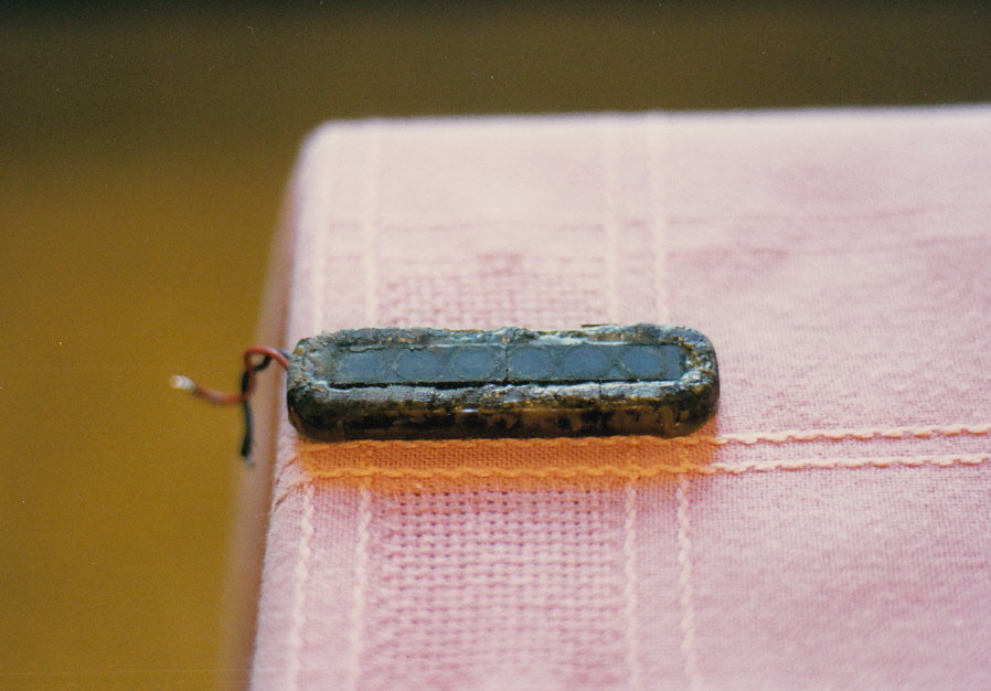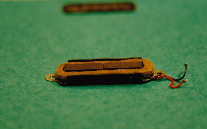 Red Special neck pickup without cover, upright view. This coil was also encapsulated in Araldite by Brian. Neck pickup: 6.96K 1.620H Magnet: North approx 500-570 gauss. There is no steel baseplate on the Neck pickup and this alters the inductance and the tonal makeup produced by the neck pickup.