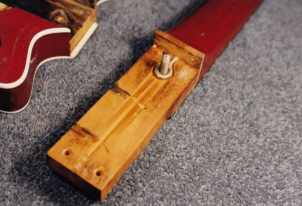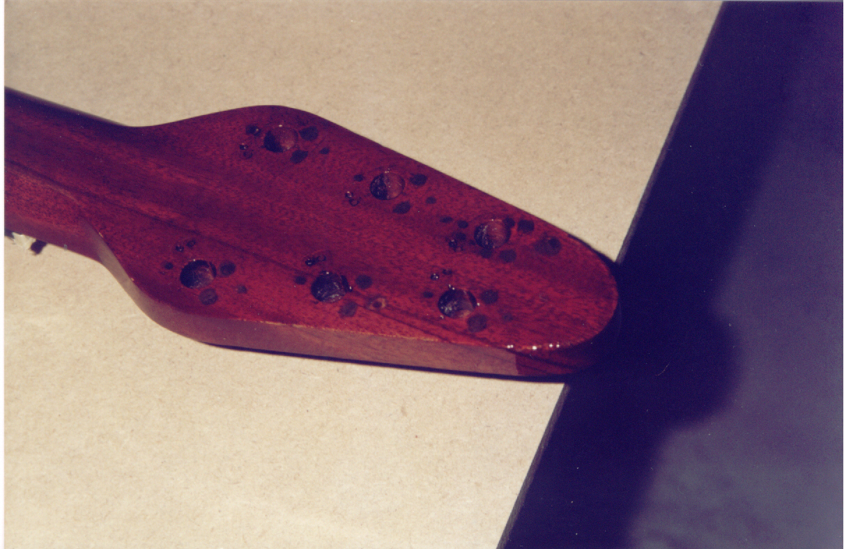 Neck: mahogany dowels made for glueing into various screw holes in headstock, these screw holes were from the first set of tuning heads which Brian fitted when the guitar was made, and also from the Gotoh locking heads which were fitted sometime in the 1980s.
