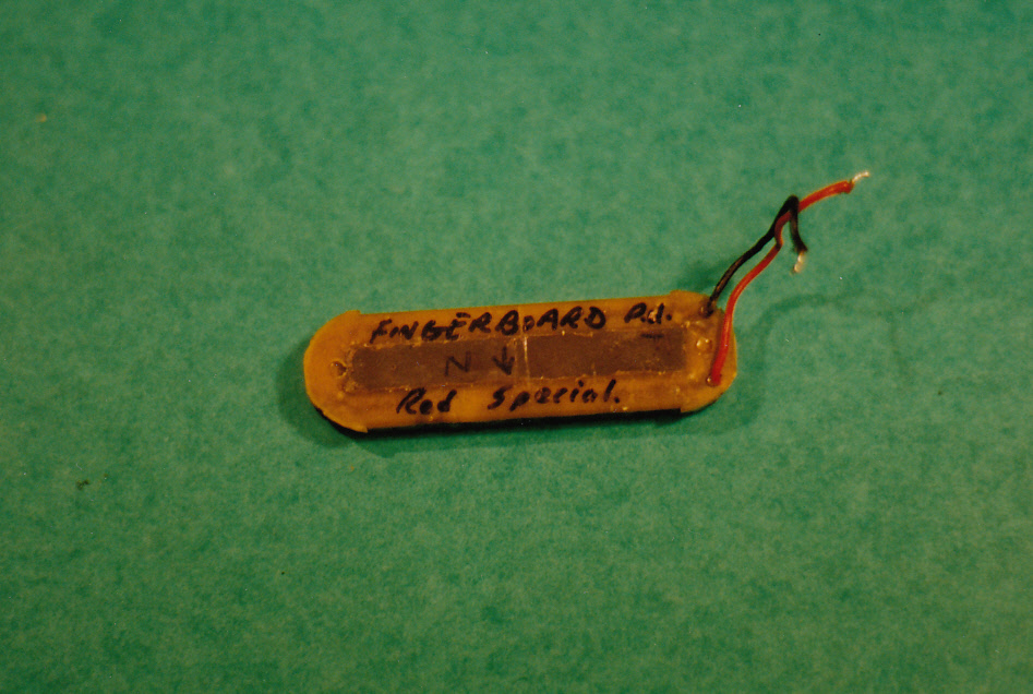 Red Special neck pickup without cover, bottom view. Brian removed the baseplate from this pickup and encased the coil and magnet in the epoxy resin Araldite, easily seen in this pic. Having no baseplate gave the pickup a lower inductance and a different sound to the other two Burns Trisonics and therefore created some very interesting sounds when used by itself or combined in or out of phase with the other two pickups. The famous ‘neck and middle pickups out of phase’ Brian May sound would not have come about if the neck pickup had its baseplate as per usual. The swirling harmonics and overall tone of that particular sound happens because of the disssimilar pickups combining in the interesting way they do…. and also because of the little matter of Brian’s incredible ‘feel’ and deft touch as a guitar player