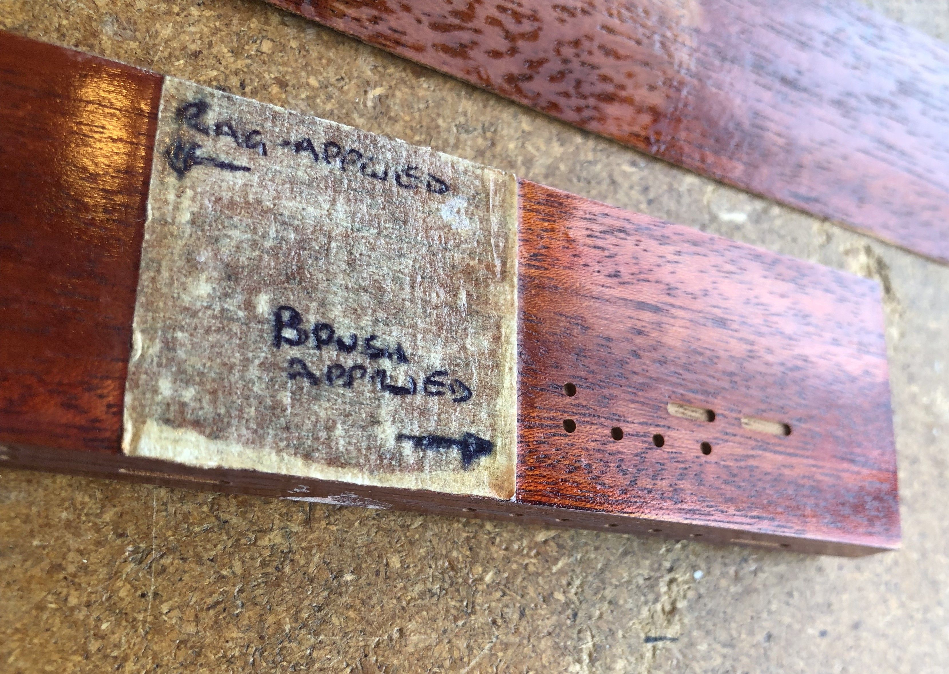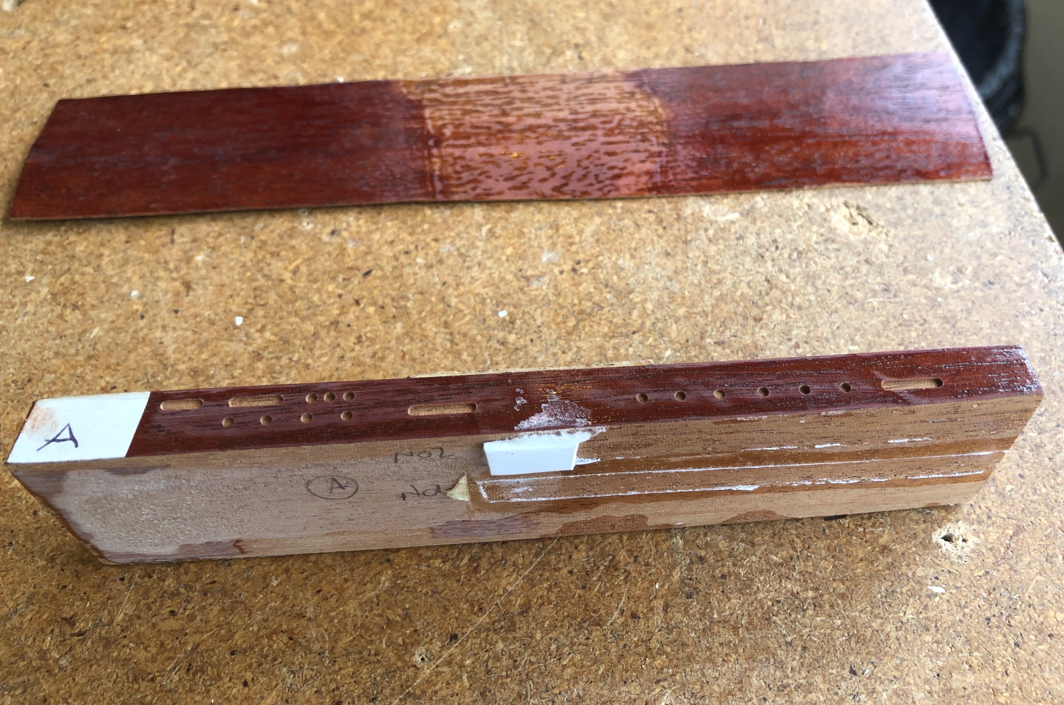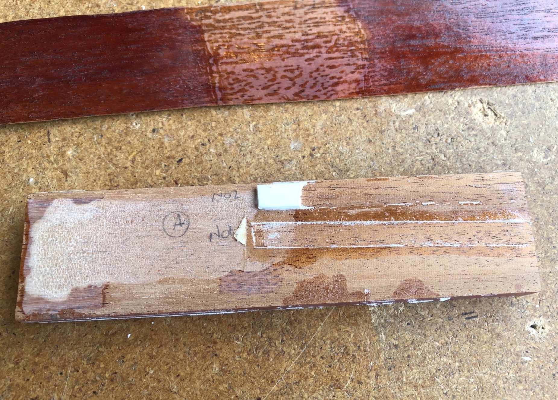 In March 2026 I still have this test piece of mahogany from 1998 and you can see Martin’s handwriting on the side and edge tags after he had tried rag application of stain and then brush application. You can also see my white binding glueing experiments, with a small piece of binding still glued onto the mahogany surface. I tried glueing pieces of binding onto the bare wood and also onto the painted side which had the Rustins surface, reasoning that Brian’s Red special binding channel would also have a mixture of bare wood and Rustins paint that the new binding glue mix would need to adhere to as best as possible. After glueing various overhanging pieces of white blinding, the following day I tore them off by hand and assessed which combination of glues worked the best. You can see my pencilled ‘No 1’ and ‘No 2’ which kept track of the glue combinations I had used.