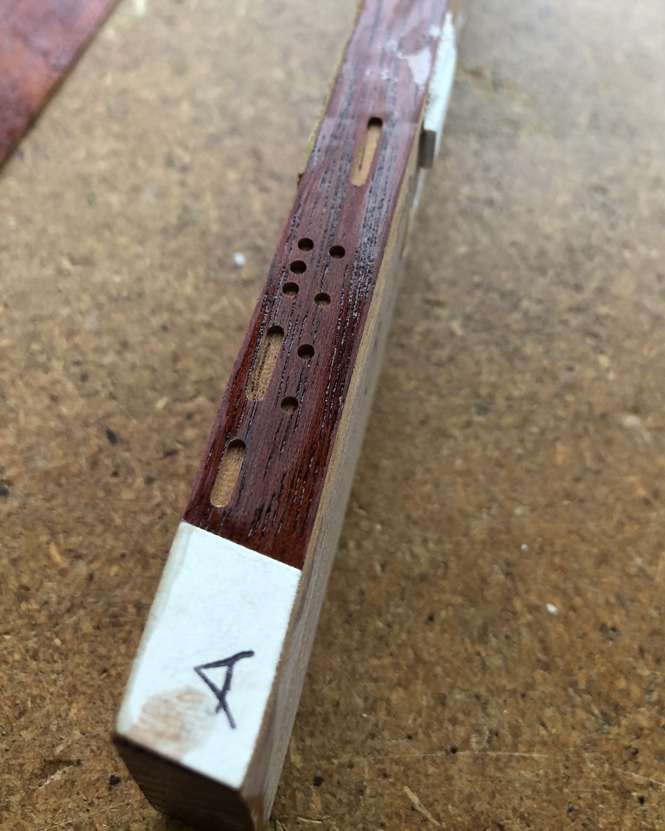 Brian asked if I could inlay these dots/stripes into the surface of the Red Special’s fingerboard in a similar way to how I did them on my 3 Red Special replicas.