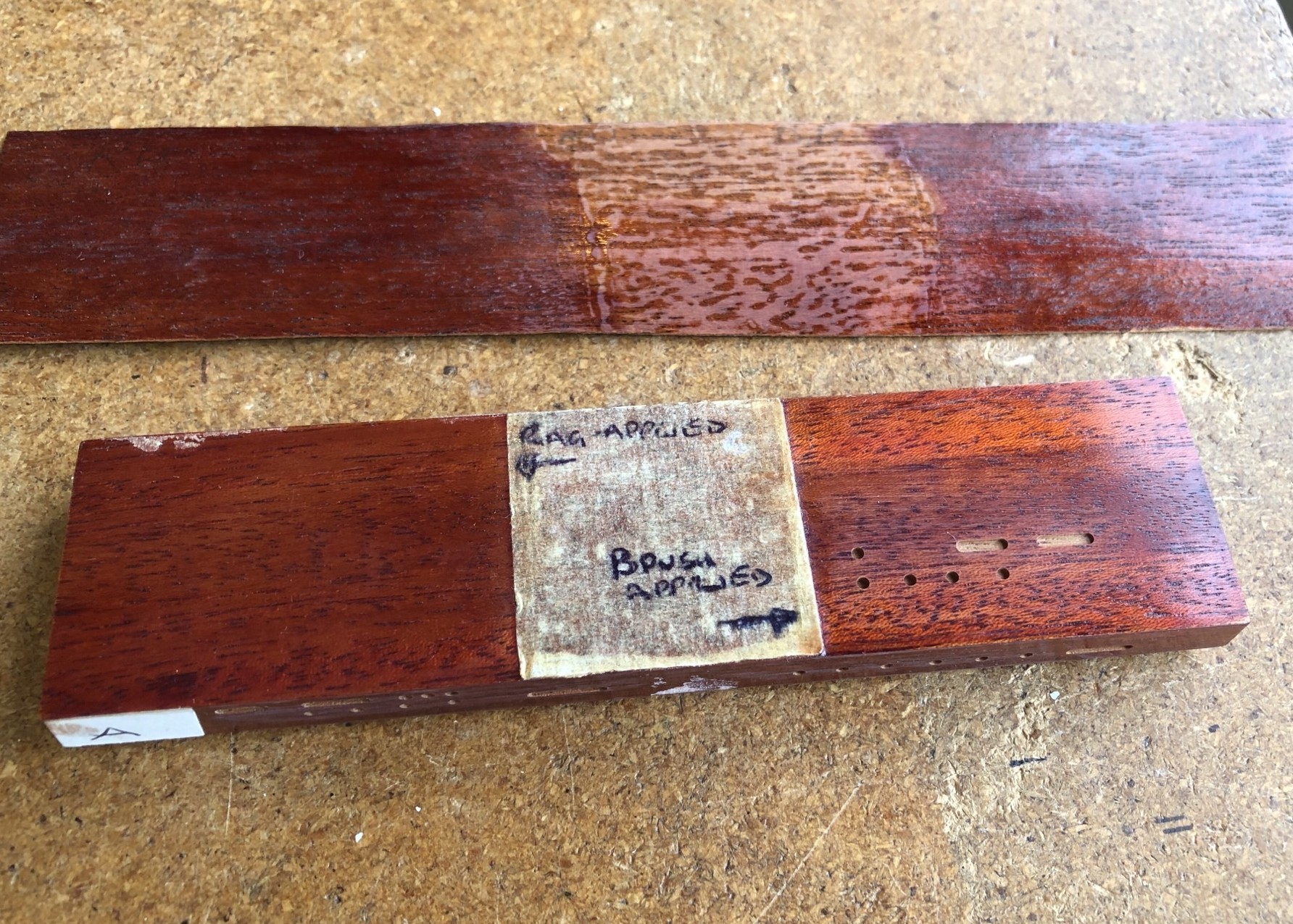First I did a test run on a piece of mahogany which Martin James (from Foxell and James the paint suppliers) and I had prepared with stains to attempt to replicate the Red Special’s red Furniglass stain overcoated with Rustins Plastic Coating. I also used this test piece to assess different combinations of glues for the re-glueing of the white binding on the Red Special’s body.