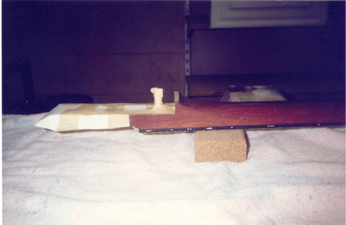 Thanks to Mark Reynolds for the next series of photos taken on Monday 4th May 1998 at Leicester at his step father’s spray painting booth. Photos show preparation before spray painting the neck and body, with everything masked up and degreased several times to remove oil, wax and silicone contaminants from the surface to be painted.