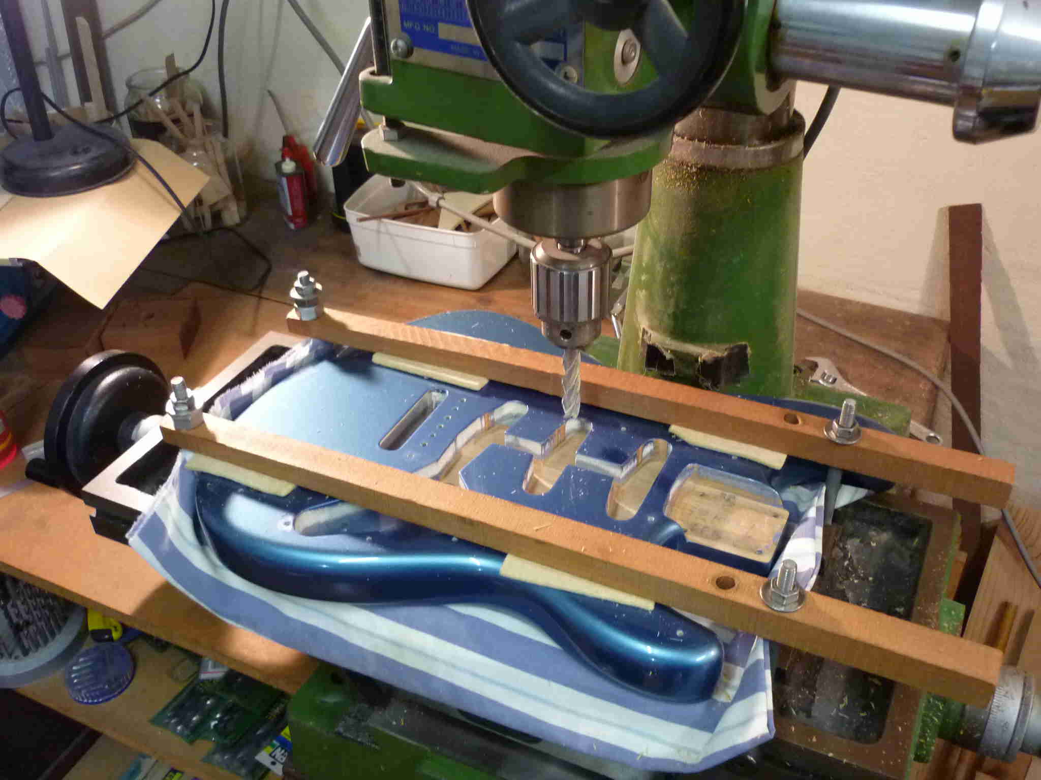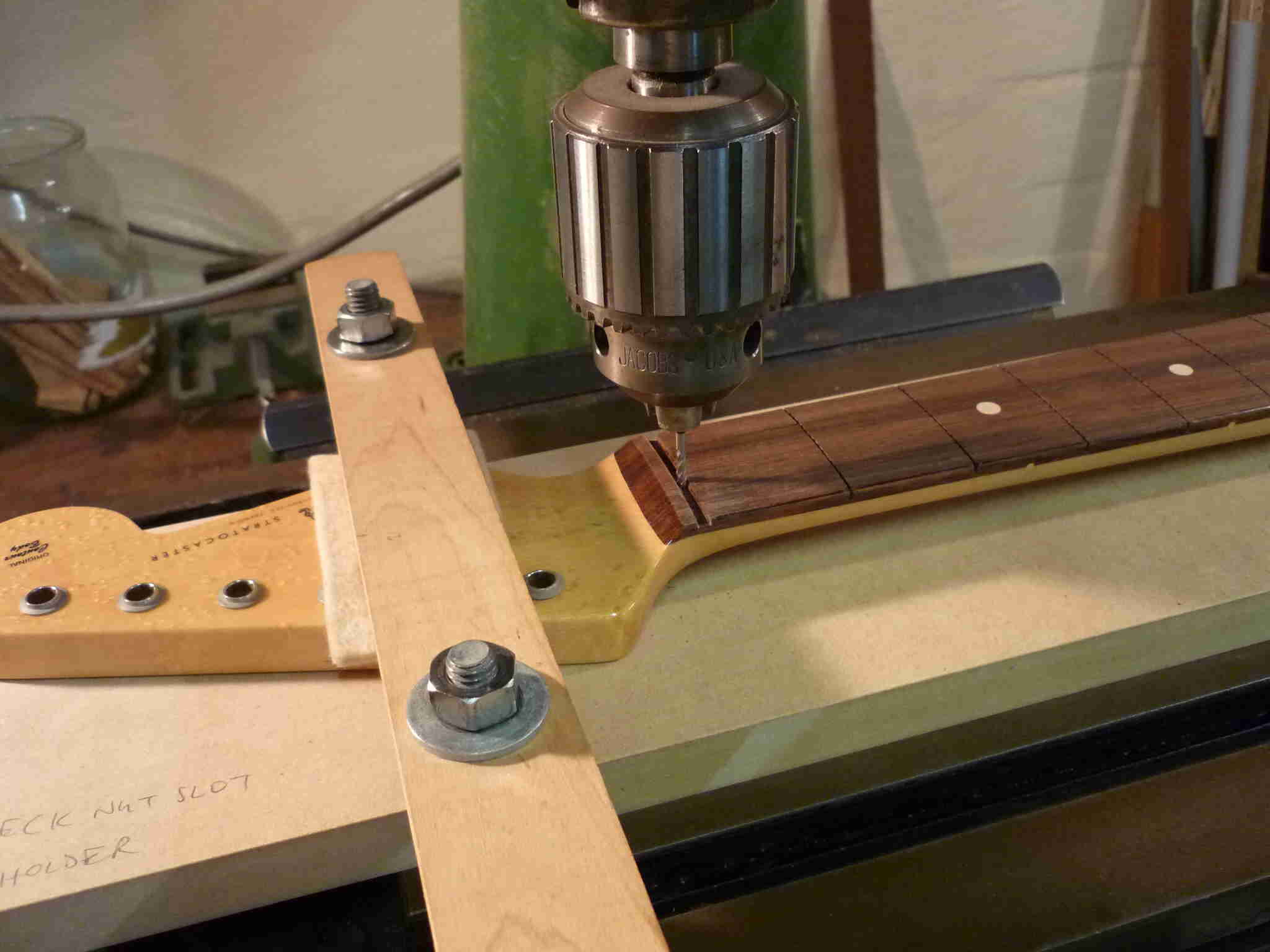 Here are 2 examples of using my milling machine in my Sydney workshop: the first is milling the nut slot of a Strat® neck using a 1/8″ dia end mill, and the second using a 1/2″ dia end mill long series to mill the pickup cavities of a Strat® body. Hopefully I can soon find photos from 1997 of using the milling machine to mill Red Special necks.
