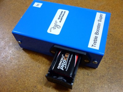 The Treble Booster Super pedal is powered either by 9V battery or 9V Adaptor.