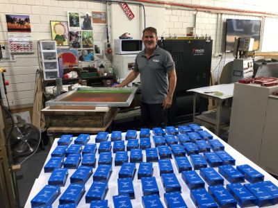 Today the boxes for the new batch of Treble Booster Super pedals were screenprinted at Adam’s screenprinting factory.